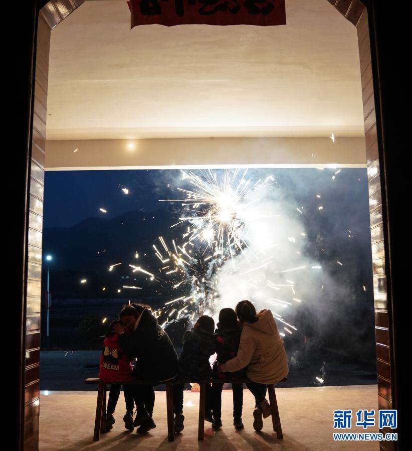 2月4日晚,王翩(右一)和學(xué)生一起欣賞煙花。新華社記者 胡晨歡 攝