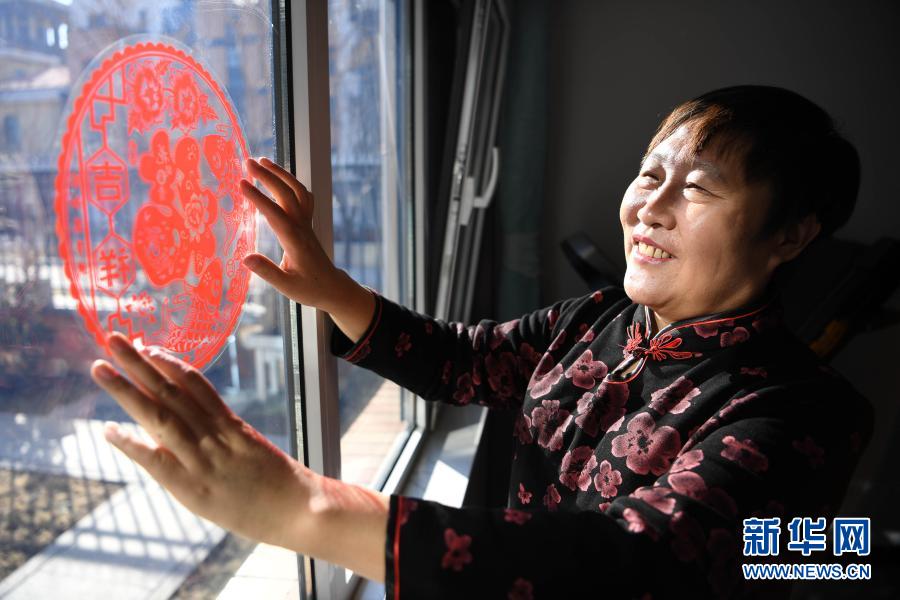 陳志昊的母親龐麗在山東泰安的老家中貼福字(2月8日攝)。
