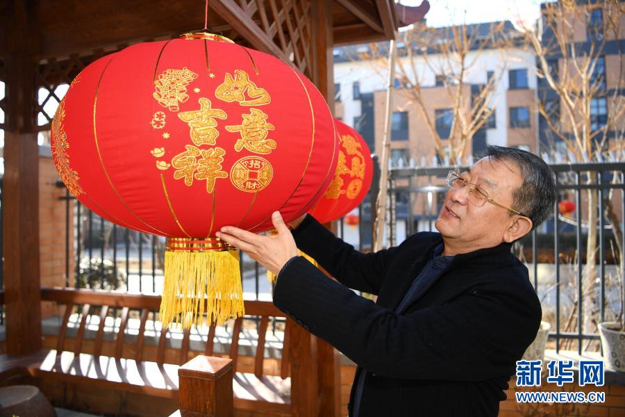 陳志昊的父親陳國(guó)謙在山東泰安的老家中掛紅燈籠(2月8日攝)。