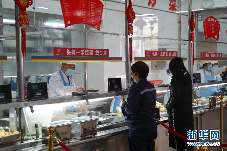 2月8日,北京交通大學(xué)學(xué)生四食堂工作人員為留校人員打飯。