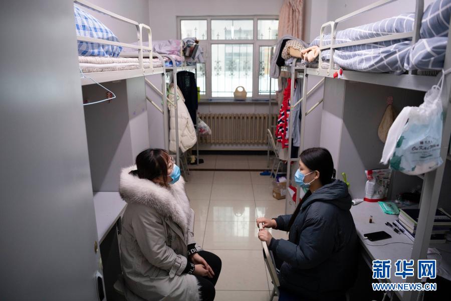 王舒婷(左)在學(xué)生公寓樓內(nèi)與一名留校學(xué)生交談(2月1日攝)。新華社記者 謝劍飛 攝