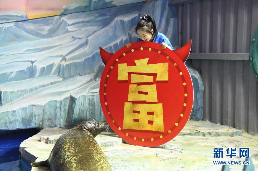 在哈爾濱極地館,馴養(yǎng)師蔣蕊和海豹互動(2月8日攝)。新華社發(fā)