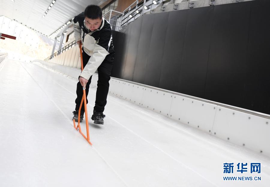 制冰師朱永濤在國家雪車雪橇中心給冰面開槽(1月27日攝)。朱永濤,29歲,是中國第一支雪車雪橇賽道專業(yè)制冰隊伍的一名制冰師。朱永濤和隊友最重要的工作,就是把賽道平整度和光滑度手工打磨至最佳狀態(tài),供在這里訓練的中國國家隊安全使用。隨著冬奧會的腳步臨近,今年他又一次不能回到老家河南安陽過年。朱永濤說“2021年將是逐夢的一年。希望和隊友一起,把賽道維護保養(yǎng)得更漂亮、更平滑,也希望可以和國際制冰師學到更多制冰技術(shù),期待2020年北京冬奧會取得圓滿成功,希望中國運動員能夠在國家雪車雪橇中心這條我們自己建的賽道、我們親手制作出來的冰面上獲得金牌?!?/p>