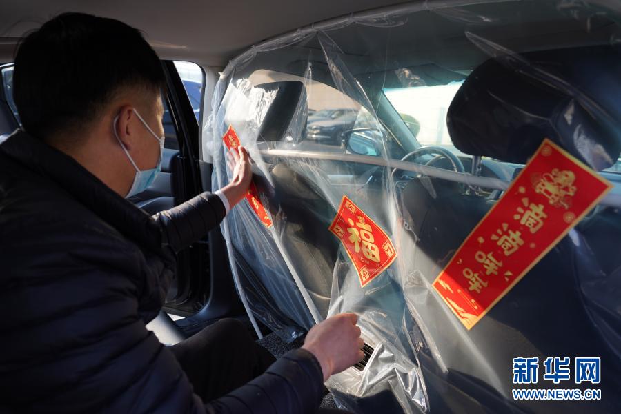 老家在湖北孝感的滴滴專車司機(jī)魏闖來在車?yán)镔N福字(2月9日攝)。今年,他選擇和妻子、孩子在京過年。