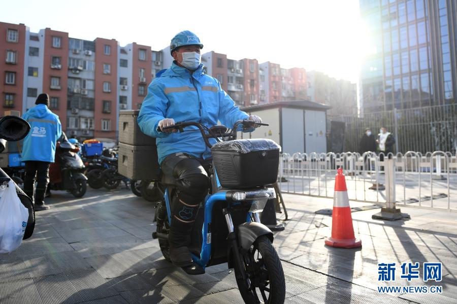 盒馬鮮生棗園店配送員劉樹才出發(fā)配送(2月5日攝)。劉樹才,41歲,來自黑龍江省五常市,來到北京已經(jīng)有10年。2020年3月,劉樹才加入盒馬鮮生成為一名配送員,負(fù)責(zé)門店附近3公里以內(nèi)的貨物配送,日均配送約60單。今年過年,他選擇和妻子孩子一起留在北京過年,“老家七十多歲的父母都很支持我的工作,今年過年不能回家,我尋思跟爸媽說一句,讓他倆在家別舍不得花錢,多買點(diǎn)好吃的?!眲洳耪f。