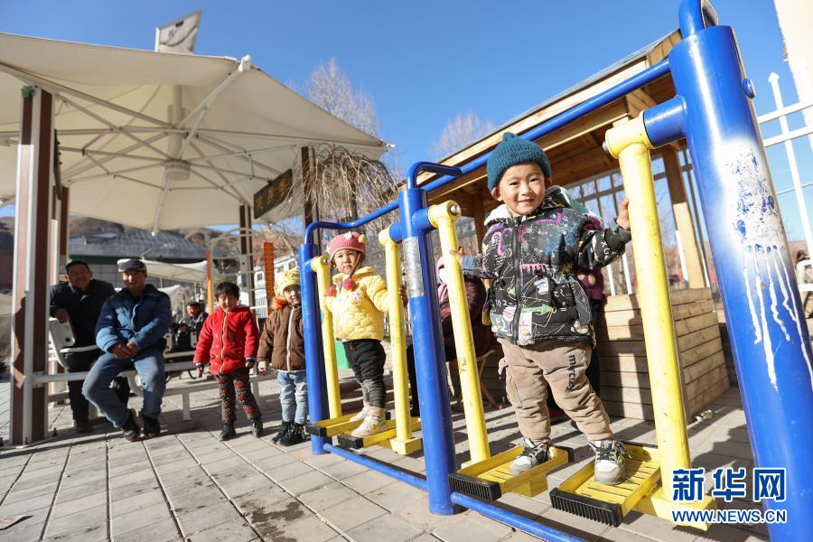 2月5日,在青海省海東市平安區(qū)三合鎮(zhèn)的易地搬遷集中安置區(qū),村民們?cè)谛^(qū)廣場(chǎng)上玩耍。
