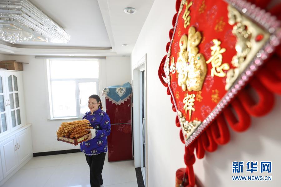 2月5日,在青海省海東市平安區(qū)三合鎮(zhèn)的易地搬遷集中安置區(qū),翻身村村民李扎西卓瑪在家中準(zhǔn)備年貨。