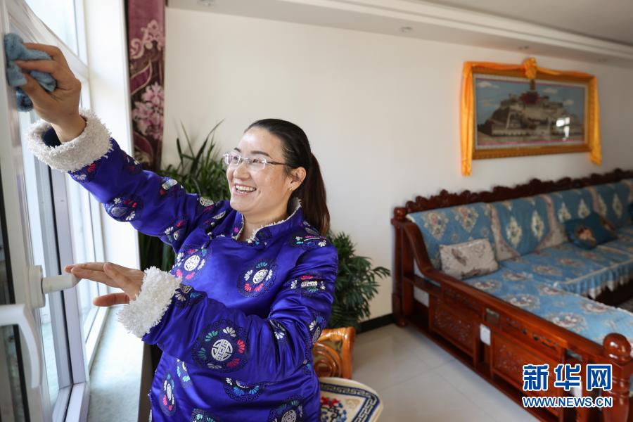 2月5日,在青海省海東市平安區(qū)三合鎮(zhèn)的易地搬遷集中安置區(qū),翻身村村民李扎西卓瑪在家中打掃衛(wèi)生。