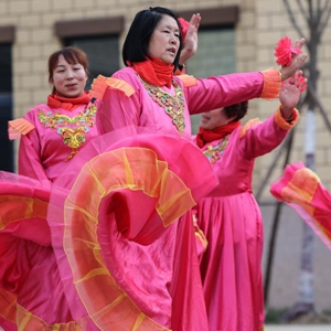 邊慶紅(左二)參加居民藝術(shù)團(tuán)的排練,為春節(jié)期間給鄉(xiāng)親們表演做準(zhǔn)備(2月5日攝)。新華社記者 朱崢 攝