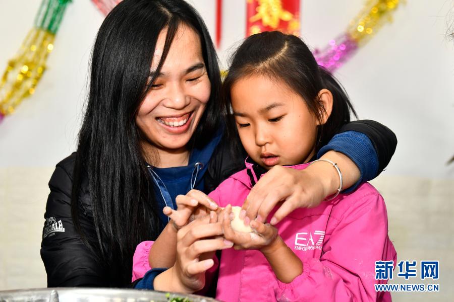 2月10日,在濟(jì)(南)萊(蕪)高鐵中鐵十局一工區(qū),就地過(guò)年的職工和女兒一起包水餃。
