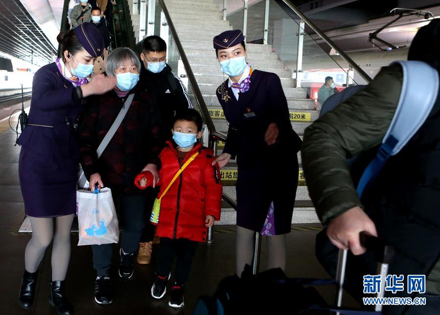 2月10日,G1347次高鐵列車的乘務(wù)員在上海虹橋火車站協(xié)助旅客上車。