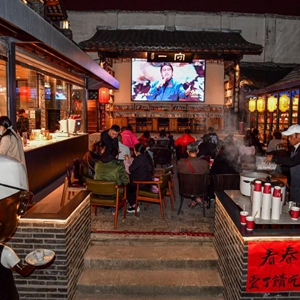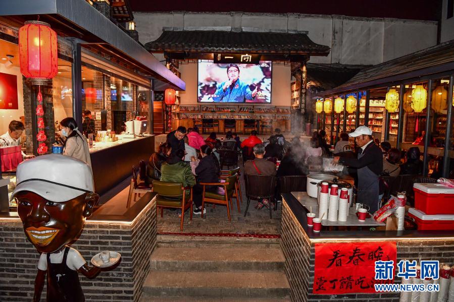 除夕夜,成都寬窄巷子景區(qū)內(nèi)的壹丁24小時書吧咖啡館響應(yīng)“就地過年”倡議,推出“來寬窄吃團圓飯看春晚”活動。上百名市民、游客圍坐在古樸的寬窄巷子院壩里,享受露天看春節(jié)聯(lián)歡晚會的樂趣。壹丁24小時書吧咖啡館的創(chuàng)始人還準(zhǔn)備了餃子、湯圓請游客免費品嘗,成為一道別樣的年夜飯。