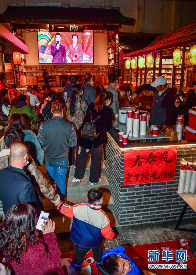 除夕夜,成都寬窄巷子景區(qū)內(nèi)的壹丁24小時(shí)書吧咖啡館響應(yīng)“就地過(guò)年”倡議,推出“來(lái)寬窄吃團(tuán)圓飯看春晚”活動(dòng)。上百名市民、游客圍坐在古樸的寬窄巷子院壩里,享受露天看春節(jié)聯(lián)歡晚會(huì)的樂(lè)趣。壹丁24小時(shí)書吧咖啡館的創(chuàng)始人還準(zhǔn)備了餃子、湯圓請(qǐng)游客免費(fèi)品嘗,成為一道別樣的年夜飯。