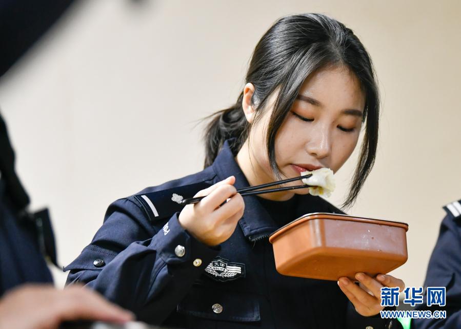 2月11日,在天津市紅橋區(qū)芥園派出所的餐廳,在崗位上過年的楊曉惠品嘗單位準備的餃子。新華社發(fā)(孫凡越攝)