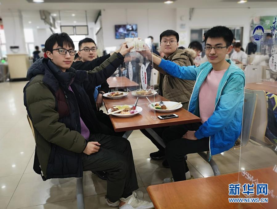 2月11日,東北大學大三學生曹澎駿(左二)和三位臨時室友吃著學校準備的年夜飯。新華社記者 王瑩攝