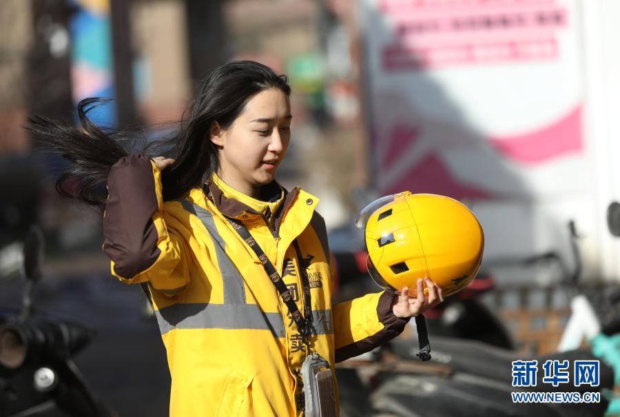 2月10日 ,美團專送騎手小月月送餐結束回到配送站點。新華社記者 楊青攝