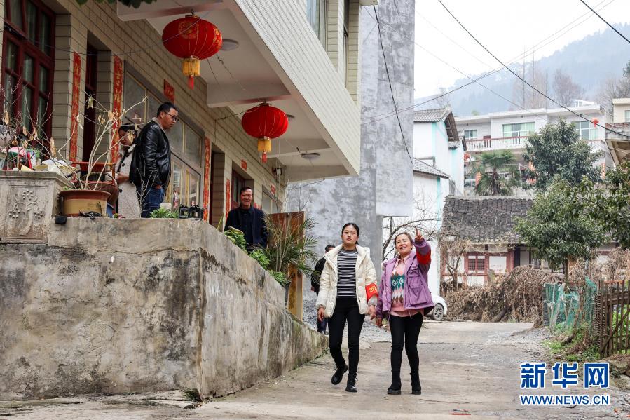 2月13日,吳窮(右一)和村干部吳洪梅在坪子社區(qū)走訪(fǎng)。新華社記者 歐東衢攝