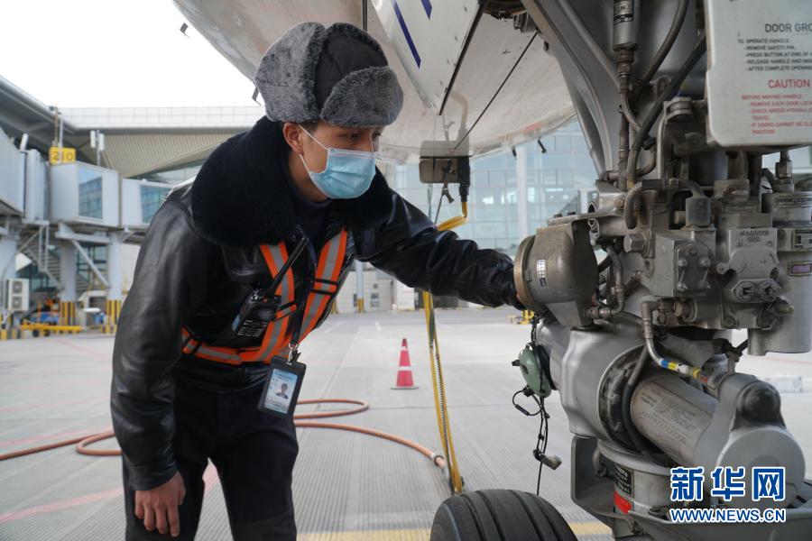 在西寧曹家堡國(guó)際機(jī)場(chǎng),機(jī)務(wù)師才華對(duì)飛機(jī)進(jìn)行常規(guī)檢查(2月8日攝)。新華社記者 張子琪 攝