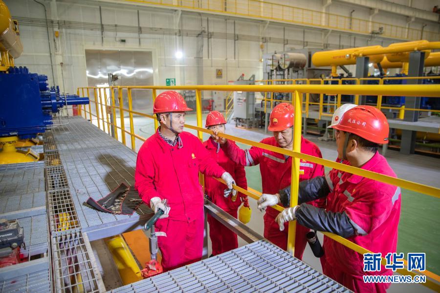 2月13日,在中國石油西南油氣田公司相國寺儲(chǔ)氣庫,陳彪(左一)與同事探討隱患處置方法。