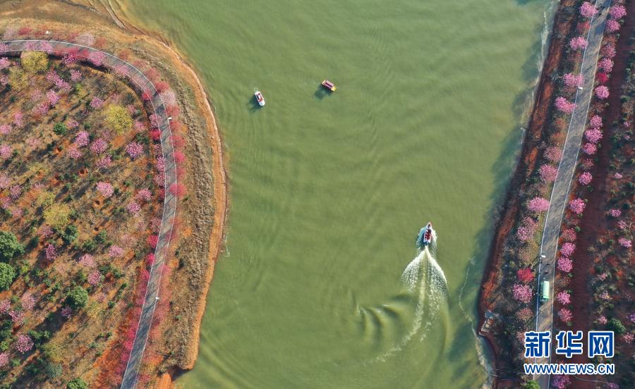 2月14日,游客在湖南省常寧市羅橋鎮(zhèn)櫻花園游玩 (無(wú)人機(jī)照片) 。新華社發(fā)(曹正平 攝)