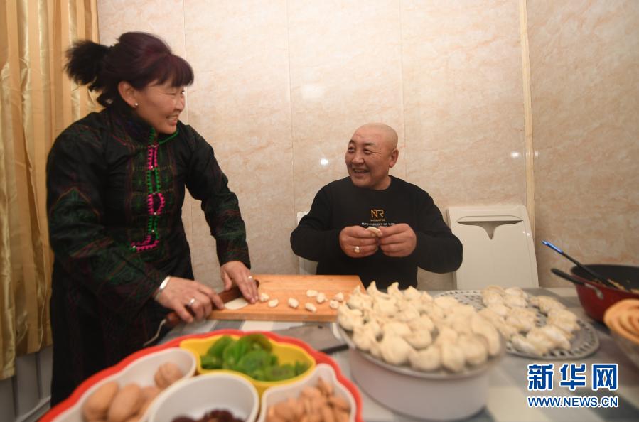 在新疆和布克賽爾蒙古自治縣鐵布肯烏散鄉(xiāng)查干阿德爾格村,村民哈爾次克和妻子在包餃子(2月11日攝)。新華社記者 沙達提 攝