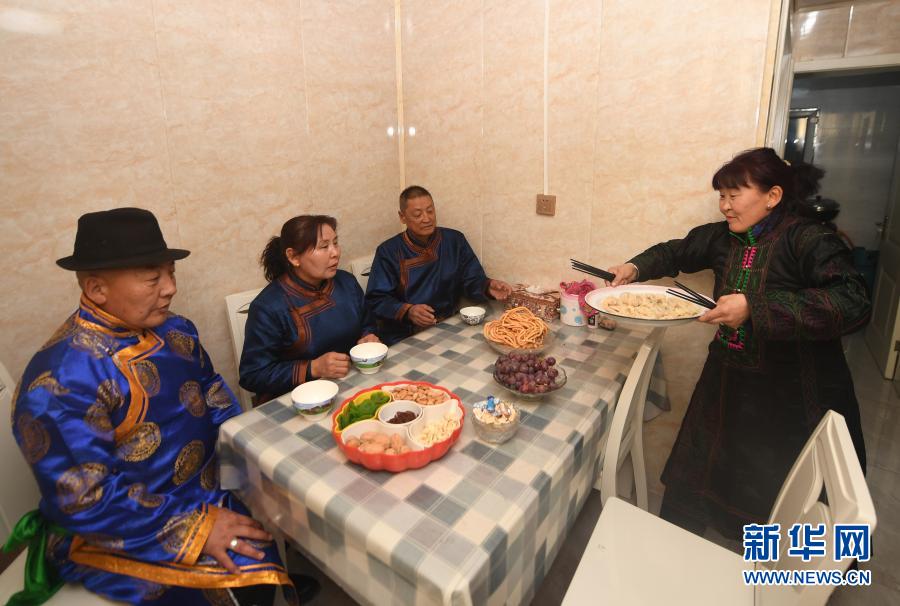 在新疆和布克賽爾蒙古自治縣鐵布肯烏散鄉(xiāng)查干阿德爾格村,村民哈爾次克(左一)在家招待前來拜年的親友(2月11日攝)。新華社記者 沙達提 攝