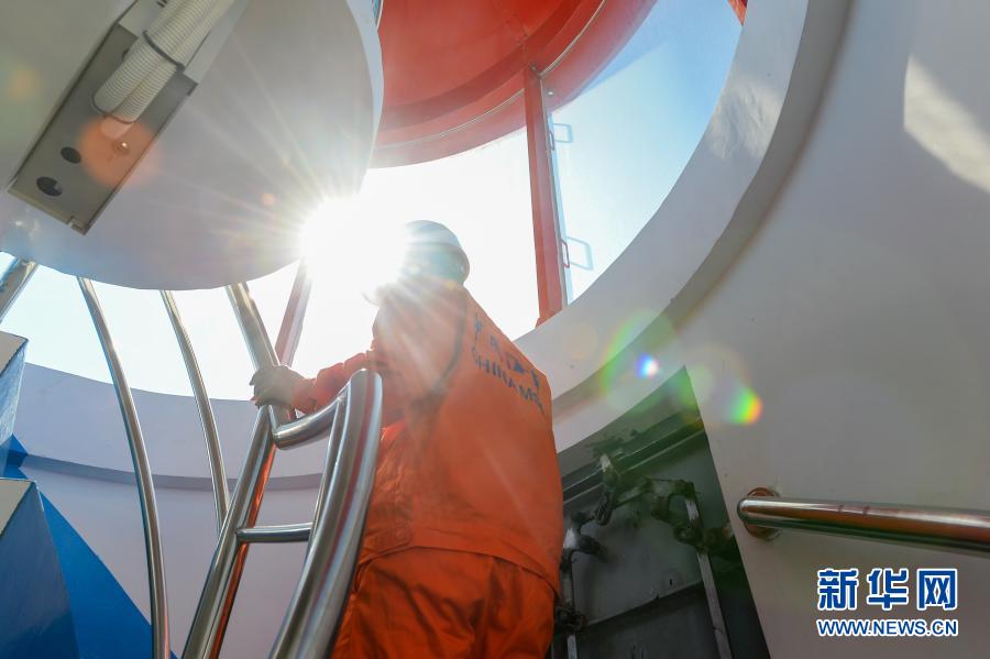 2月13日,在海南省三沙市永興島,傅建斌走上燈樁。新華社記者 周佳誼 攝