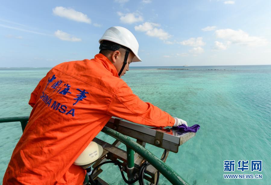 2月14日,在海南省三沙市趙述島,傅建斌在燈樁上擦拭太陽能板。新華社記者 周佳誼 攝