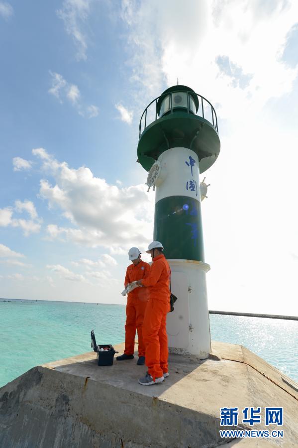 2月14日,在海南省三沙市趙述島,傅建斌(右)和同事郭馨陽準(zhǔn)備檢查燈樁。新華社記者 周佳誼 攝