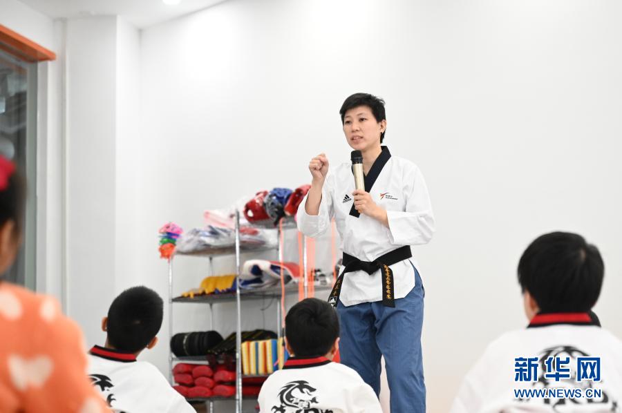 2月15日,陳燕亭在跆拳道館給小朋友傳授跆拳道知識。新華社記者 林善傳 攝