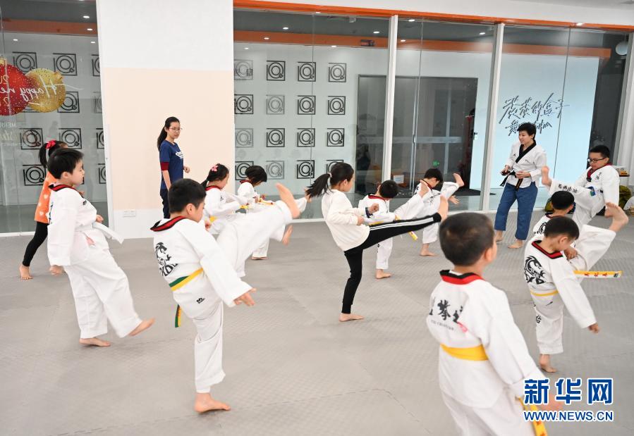 2月15日,陳燕亭(后排右二)在跆拳道館教小朋友練習(xí)跆拳道。新華社記者 林善傳 攝