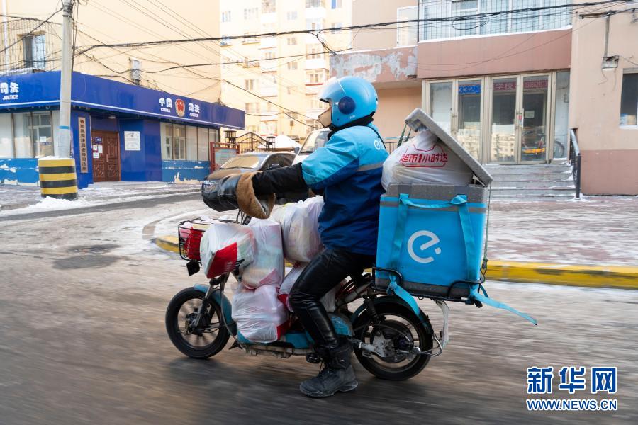 2月4日,在哈爾濱市香坊區(qū),劉剛在配送商品。新華社記者 謝劍飛 攝
