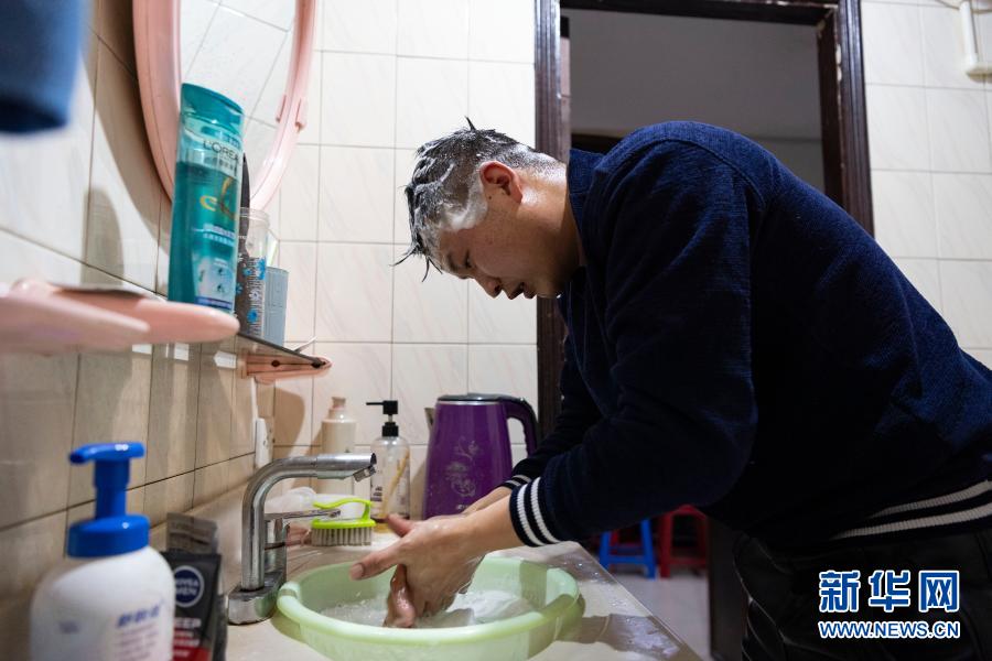 2月15日,在哈爾濱市香坊區(qū)租住的房子里,劉剛在洗頭。由于頭盔不透氣,一天下來頭上會出很多汗。新華社記者 謝劍飛 攝