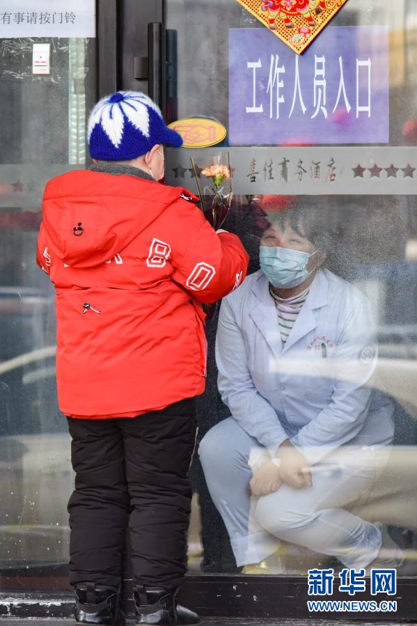 36歲的鄭瑩瑩是哈爾濱市道外區(qū)人民醫(yī)院的一名工作人員。2月1日至15日,她在道外區(qū)一處集中隔離點(diǎn)24小時(shí)值守,主要負(fù)責(zé)填寫報(bào)表、出入人員轉(zhuǎn)運(yùn)聯(lián)絡(luò)等工作。這是2月11日除夕上午,鄭瑩瑩6歲的兒子來到隔離點(diǎn)看望媽媽,還給她帶來了一朵康乃馨。因疫情防控需要,母子倆只能隔著賓館的玻璃門完成特殊的“除夕團(tuán)圓”。
