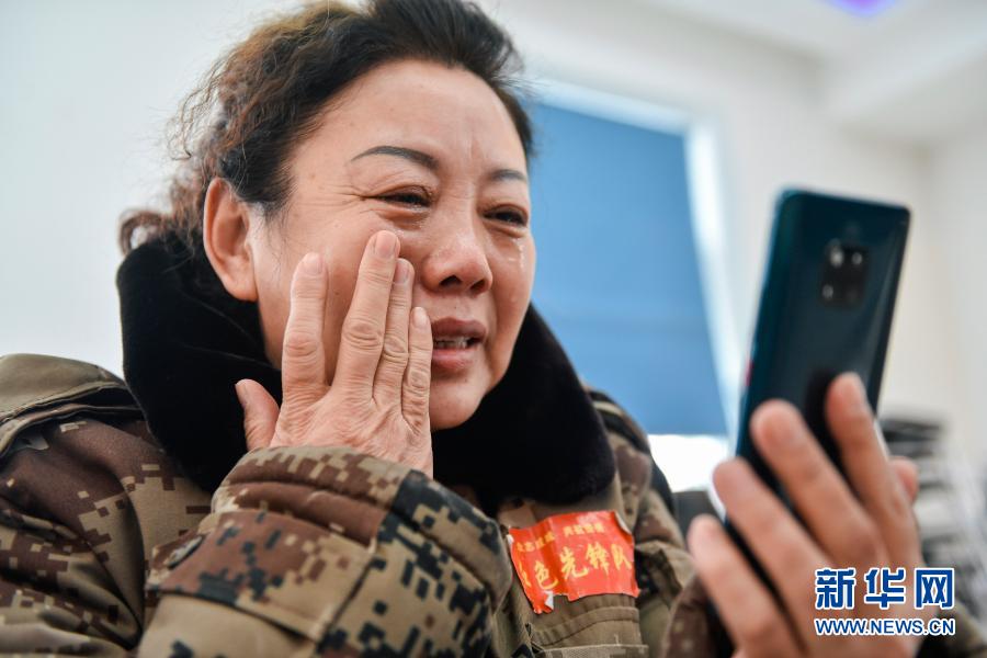55歲的趙淑華,是吉林省通化市東昌區(qū)團(tuán)結(jié)街道文化社區(qū)副主任、網(wǎng)格長。自1月12日通化發(fā)生疫情以來,臨近退休的她毫不猶豫投身抗疫一線。小區(qū)巡邏、配合入戶核酸檢測、幫助居民排憂解難、保障卡點(diǎn)餐飲供給……為了防疫工作,她吃、住都在社區(qū),24小時(shí)待命,近一個(gè)月沒有回家。這也是東昌區(qū)800余名網(wǎng)格員一個(gè)月來的防疫工作常態(tài)。在這座不大的東北山城,他們用自己的付出構(gòu)筑了一個(gè)個(gè)基層“抗疫堡壘”。這是2月16日,趙淑華與在長春的兒子、兒媳視頻通話。這一天,她的孫子呱呱墜地。在社區(qū)忙活了一上午的趙淑華直到中午才騰出空來,通過視頻看看孫子的模樣。