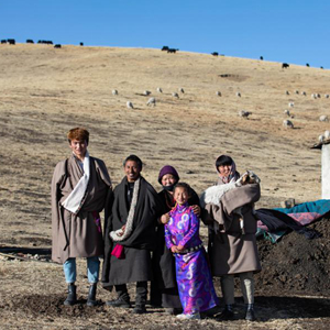 在紅原縣阿木鄉(xiāng)卡口村,向巴(左二)一家在牧場暖棚外合影(2月15日攝)。