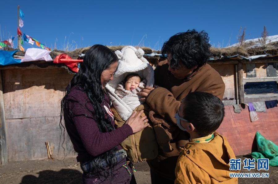 在紅原縣阿木鄉(xiāng)卡口村,頓炯(右二)和妻子央青卓瑪(左一)、兒子甲央貢嘎頓增、不足一個(gè)月大的女兒在牧場暖棚前(2月15日攝)。新華社記者 江宏景 攝