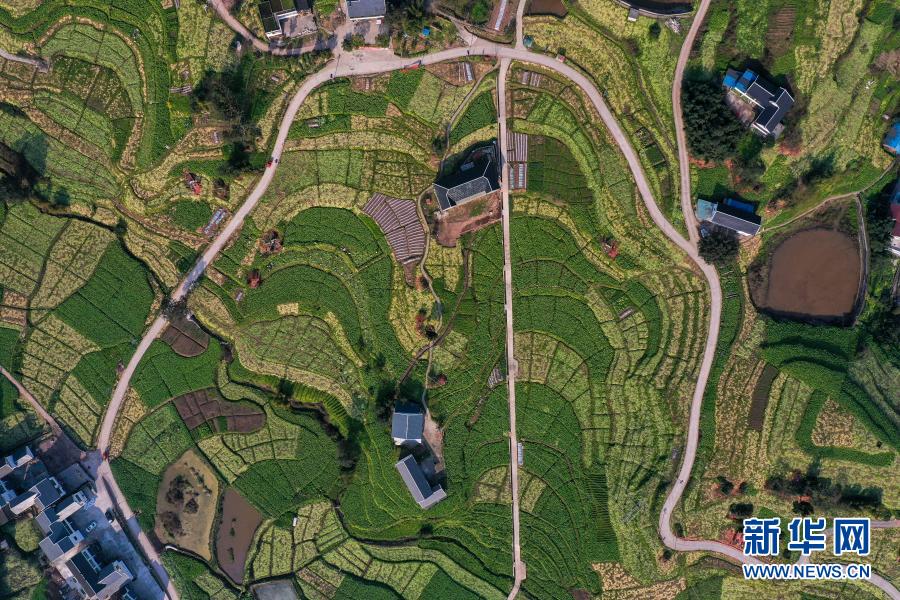 這是在重慶市涪陵區(qū)江北街道拍攝的青菜頭田地(2月20日攝,無人機(jī)照片)。新華社記者 劉潺 攝