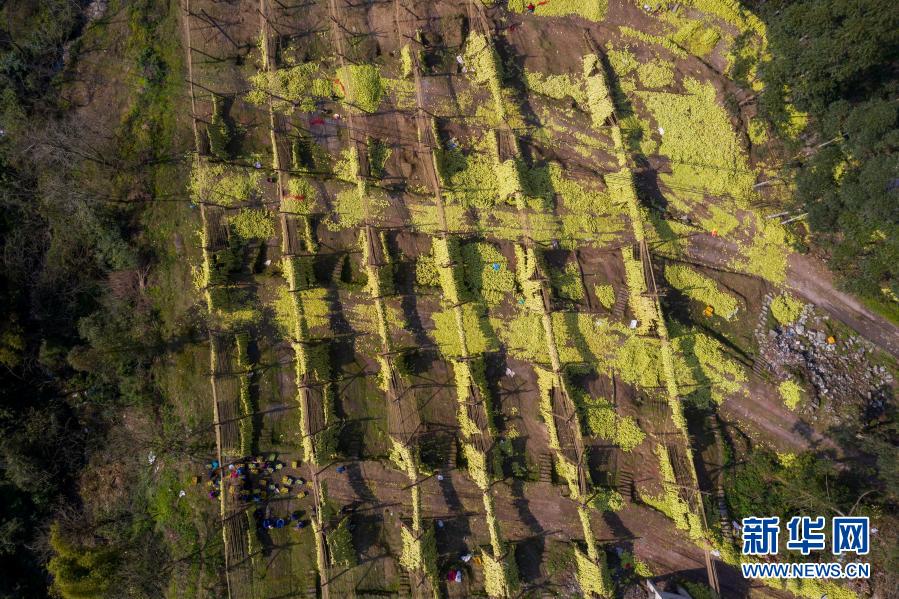 2月20日,在重慶市涪陵區(qū)馬武鎮(zhèn)一家榨菜企業(yè)的晾曬場上,成串的青菜頭在進行晾曬(無人機照片)。新華社記者 劉潺 攝