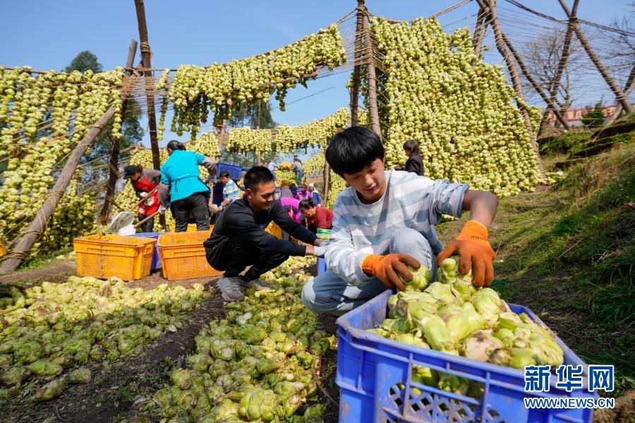 2月20日,在重慶市涪陵區(qū)馬武鎮(zhèn)一家榨菜企業(yè)的晾曬場上,工人將晾曬好的青菜頭裝筐。新華社記者 劉潺 攝