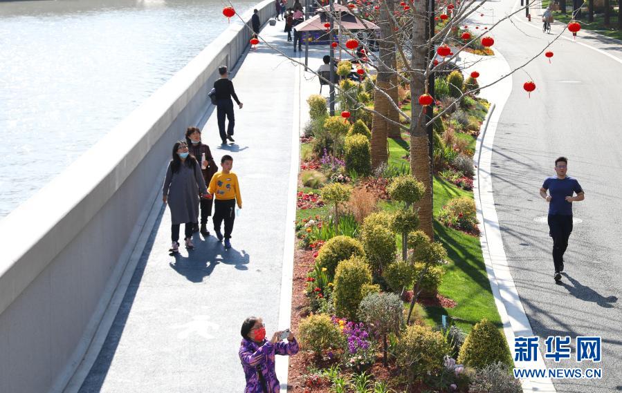 2月21日,人們在上海蘇州河邊漫步休閑。