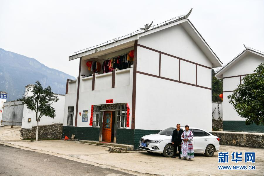 2月20日,在化屋村麻窩寨易地扶貧搬遷集中安置點(diǎn),苗族村民楊軍與妻子楊紅仙在自家新房和新車前合影。楊軍和妻子常年在浙江的圓珠筆廠務(wù)工,春節(jié)后他們想繼續(xù)外出務(wù)工,掙到本錢回家好發(fā)展其他產(chǎn)業(yè)。