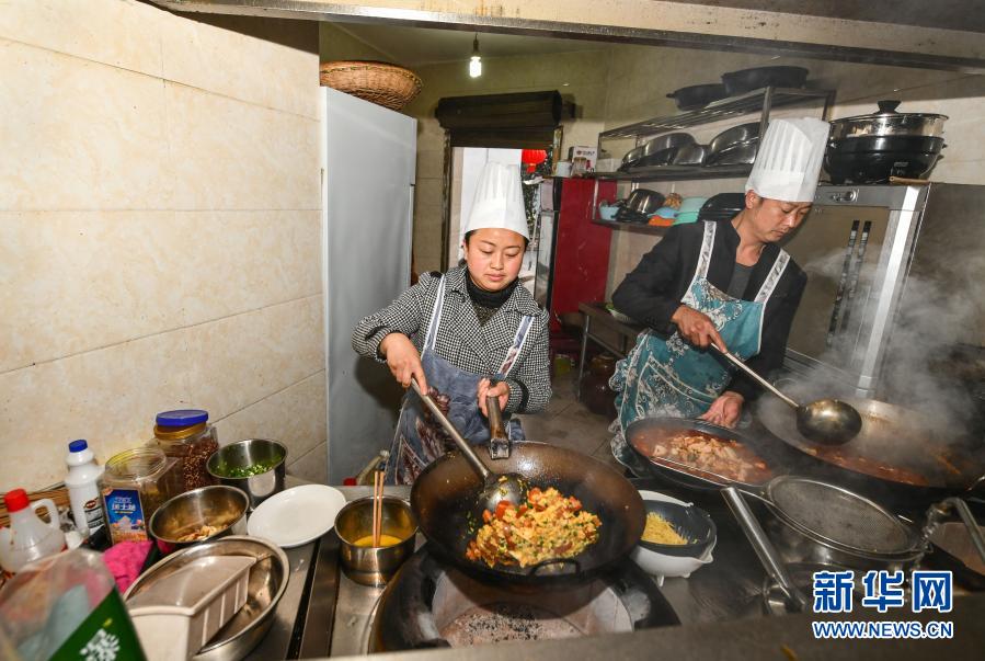 2月20日,化屋村苗族村民何蘭與丈夫楊長富在給客人做菜。2018年,何蘭和丈夫看準(zhǔn)村里的旅游市場前景,創(chuàng)辦了化屋村畫廊苗家農(nóng)莊。她希望新年通過自家的示范帶頭,帶動更多村民開辦農(nóng)家樂,一起增收致富。
