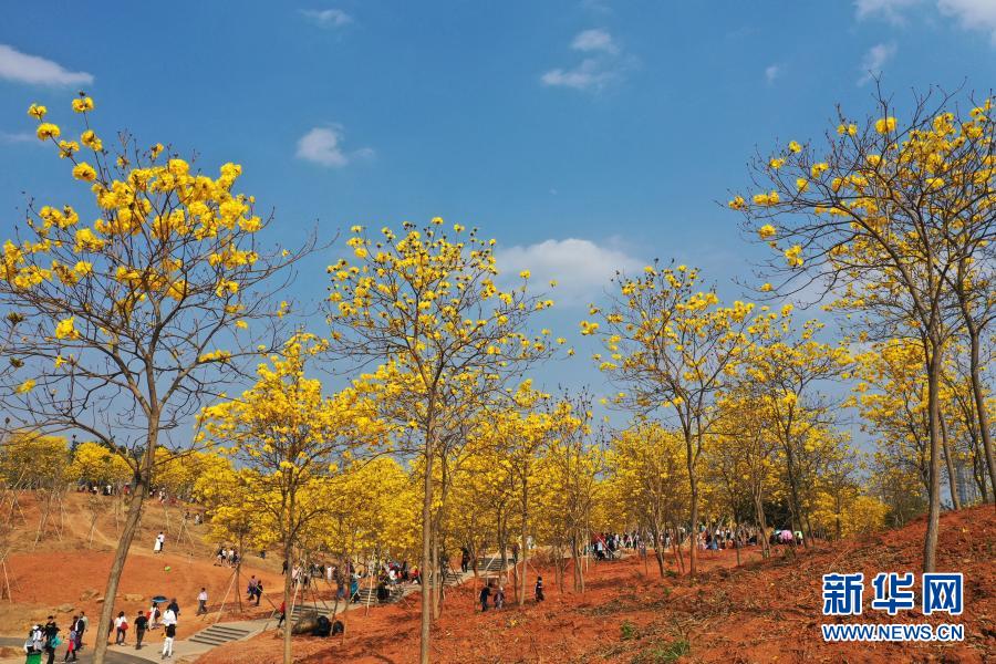 近日,廣西南寧市青秀山風(fēng)景區(qū)黃花風(fēng)鈴木盛放,吸引眾多游人前來(lái)觀賞。