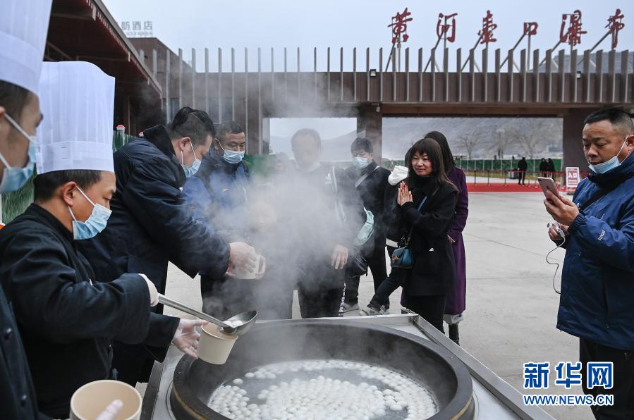 2月24日,陜西壺口瀑布景區(qū)工作人員(前左)為游客送上免費的湯圓。