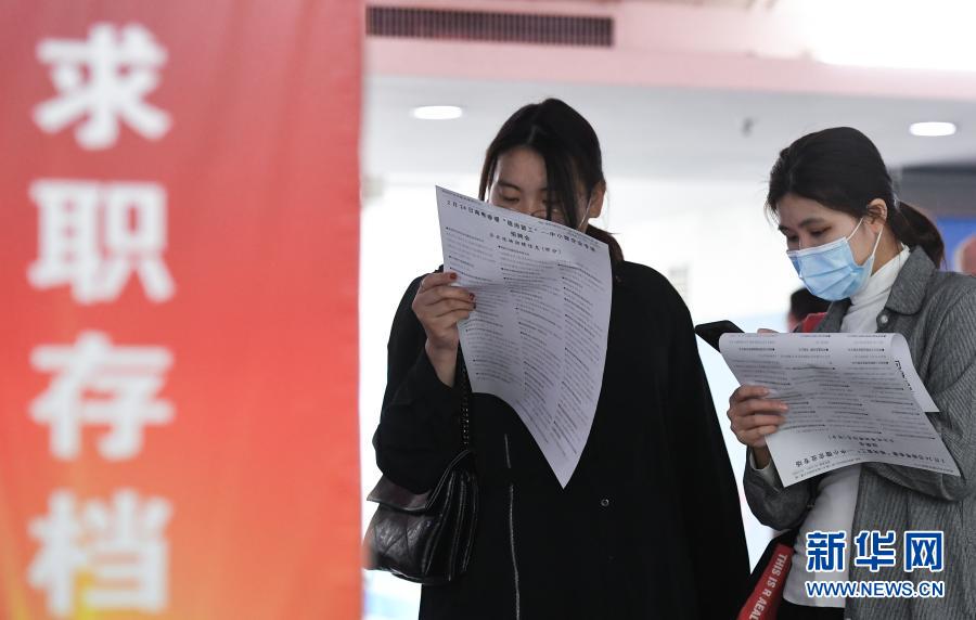 2月24日,求職人員在招聘會現(xiàn)場查看崗位情況。