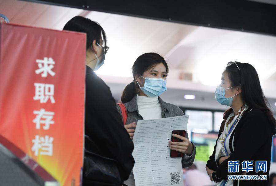 2月24日,求職人員在招聘會(huì)現(xiàn)場(chǎng)與企業(yè)招聘人員(右)交流。