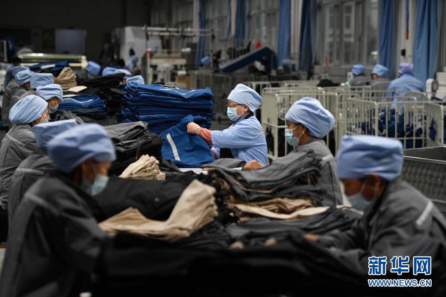 2月24日,寧夏同心縣中核(寧夏)同心防護科技有限公司扶貧車間的女工在進行服裝加工。