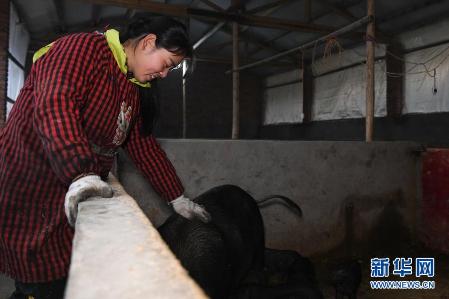 張志菊在自家農(nóng)場(chǎng)里的豬圈里喂豬(2月25日攝)。