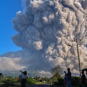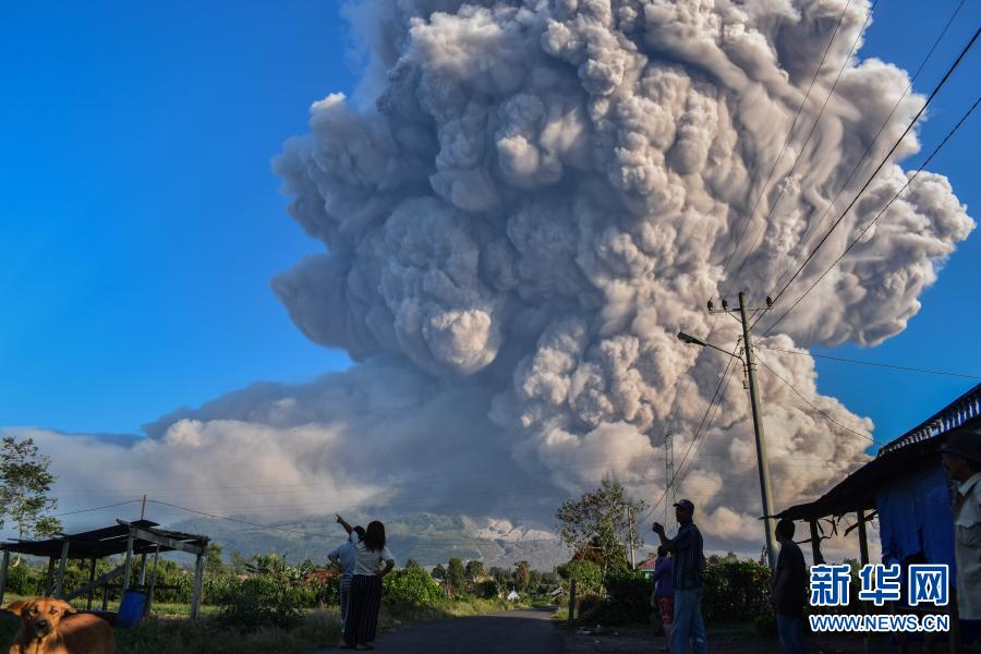 3月2日,人們在印度尼西亞北蘇門答臘省卡羅觀看噴發(fā)的錫納朋火山。新華社發(fā)(森比林攝)